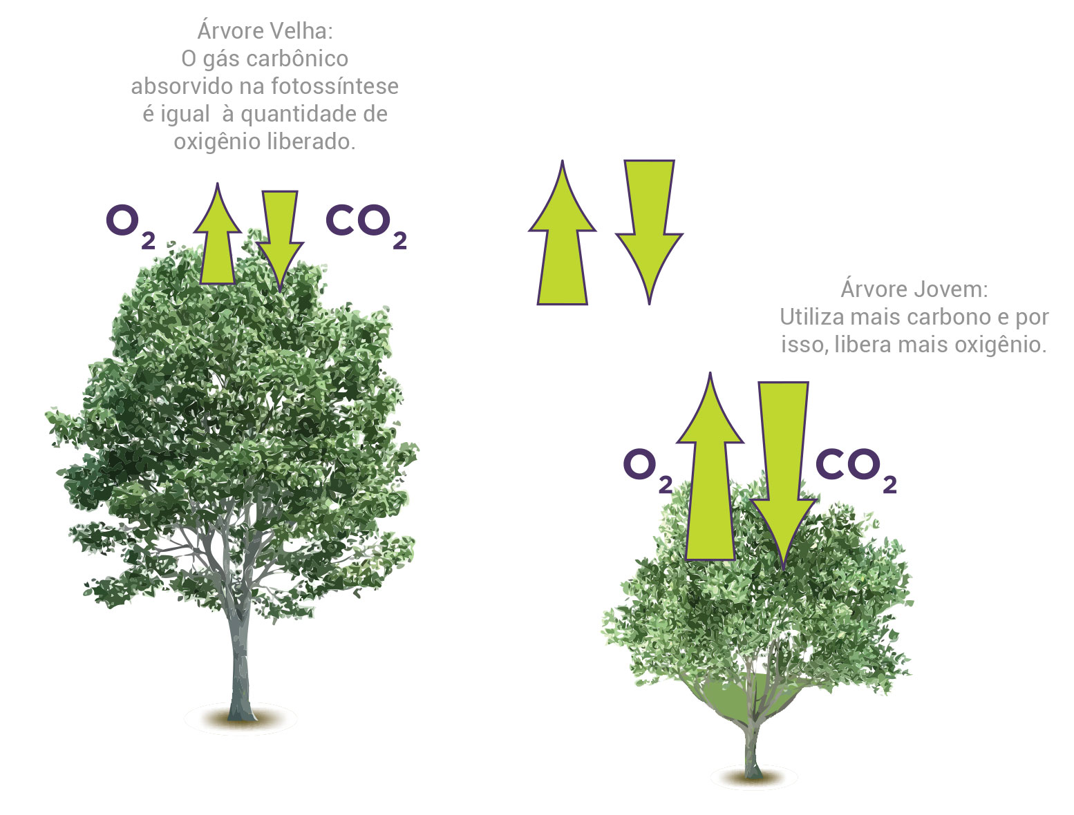 A absorção de gás carbônico e liberação de oxigênio dessa árvore jovem já é bem mais eficaz que da árvore velha que foi retirada.