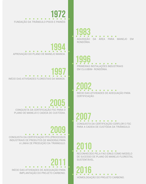 A MANOA teve início em 1983, quando a Triângulo Pisos e Painéis adquiriu 74 mil hectares de florestas em Cujubim, Rondônia. Foram anos de pesquisa para o desenvolvimento de métodos adequados para o manejo da floresta.